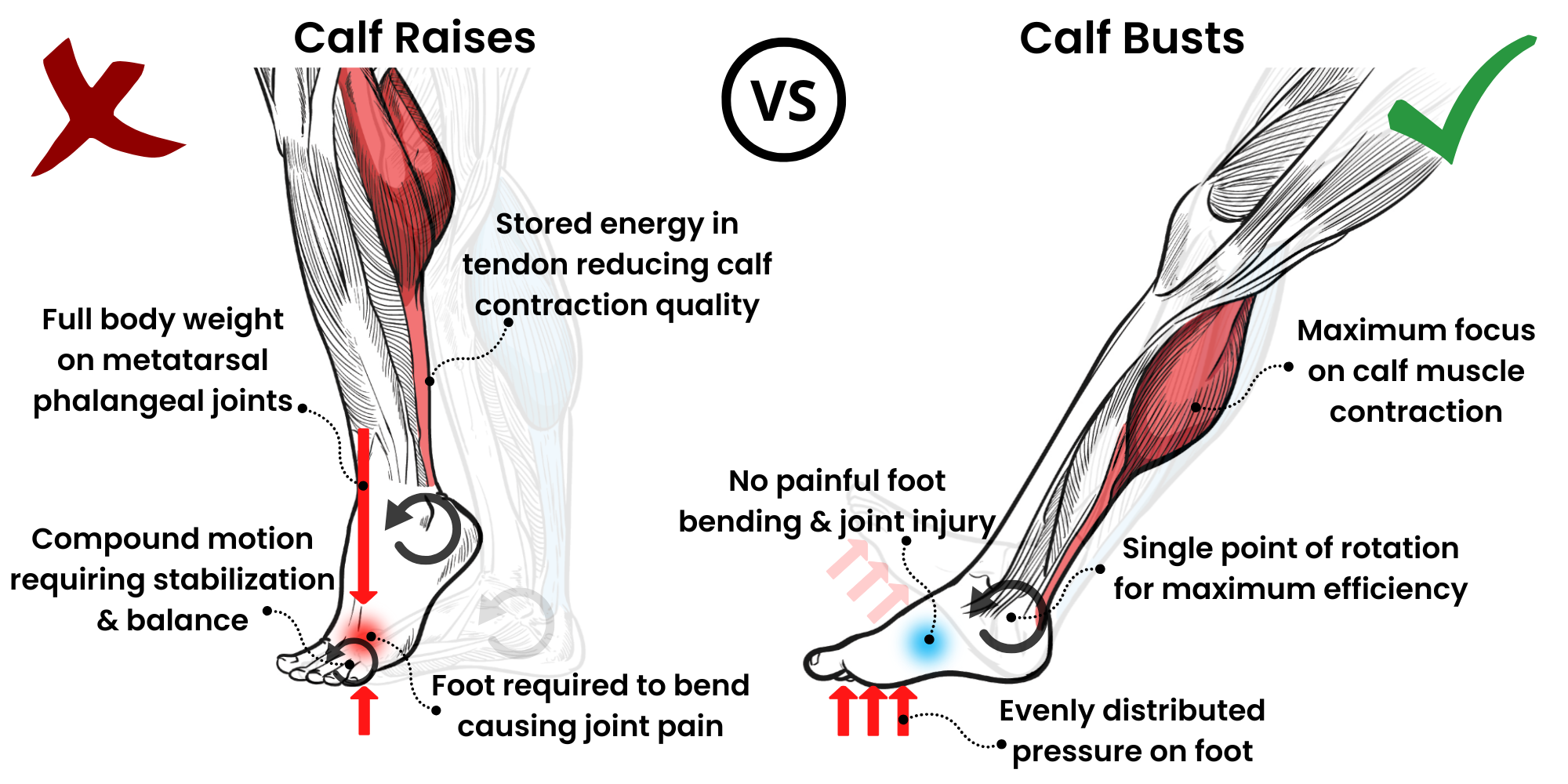Ever notice how sore your feet get while doing calf raises? That’s because your foot muscles and tendons work hard just to keep you balanced on your toes. Calf Buster reduces that work, transferring it to your calves, giving them more focused and powerful muscle contractions.
