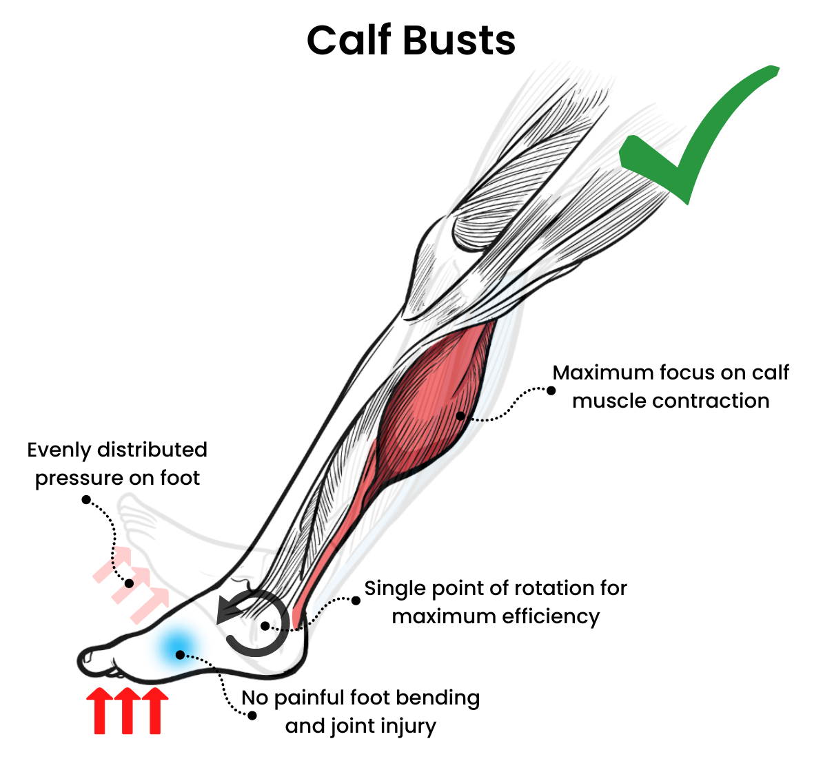 By providing 35 degrees of tensioned ankle rotation, the Calf Buster enables users to experience a deep muscle burn over the full range of their calf contractions. This extended range of motion allows for a more comprehensive activation of the calf muscles, including both the gastrocnemius and soleus. The gastrocnemius, located superficially and forming the visible bulge of the calf, is primarily involved in movements with a fully extended knee, such as jumping. On the other hand, the soleus, positioned deeper and responsible for maintaining posture and stability, is engaged during activities involving bent knees, like squat jumps.